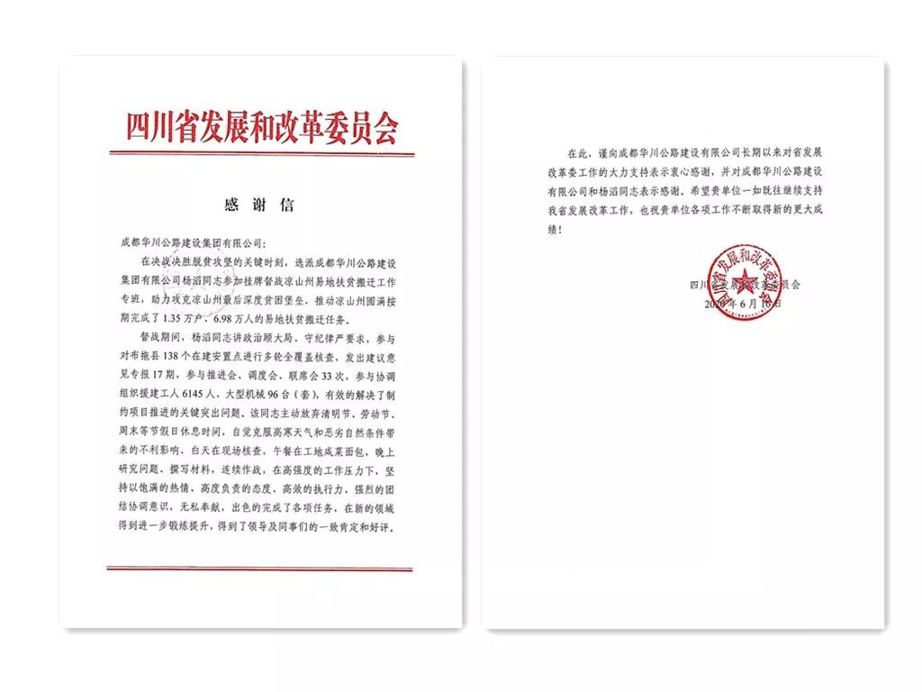 助力涼山州易地扶貧搬遷 再現(xiàn)華川人嚴格律己品質(zhì)——華川集團獲致四川省發(fā)展和改革委員會感謝信